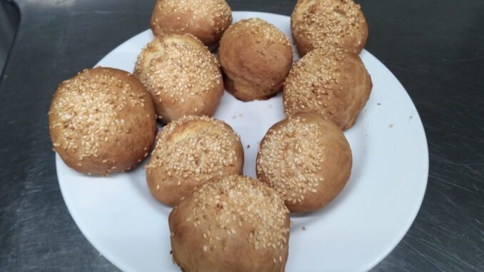 6.Arrautza irabiatu batekin ogi bolen goiko aldea brotxa batekin “marraztu” eta sesamo haziak gainetik jarriz, labea 200º bero dugula, 180º tara jaitsi, urez lainoztatu eta 15-20 minutuz labekatu. Labe guztiak ez dira berdinak, labe bateko neurriak ez dira beste baterako balio, beraz, datu hauekin kontuz ibili behar da.