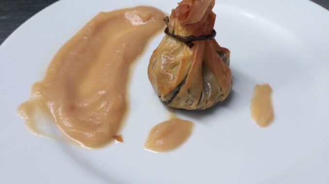 9.Plater batean zakutxo bat ipini eta aldamenean sagar salda jarriz, zerbitzatu.